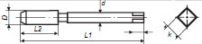 D--丝锥攻丝端规格,d--圆柄直径,k--方柄对边尺寸,选择配用筒夹时,按要配用的丝锥的d,k尺寸,选择对应尺寸的筒夹规格)